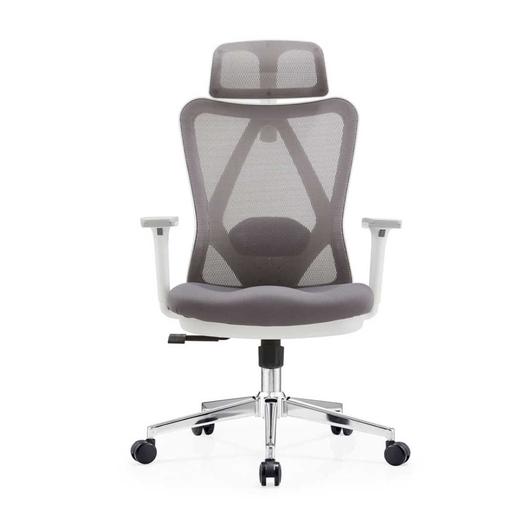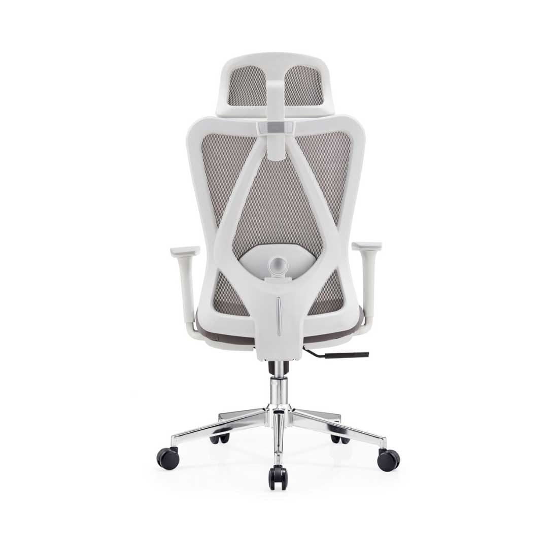 This ergonomic chair is designed for people who spend long hours at a desk. It features a breathable white mesh back, an adjustable headrest, and a thick cushioned seat that supports your posture all day.