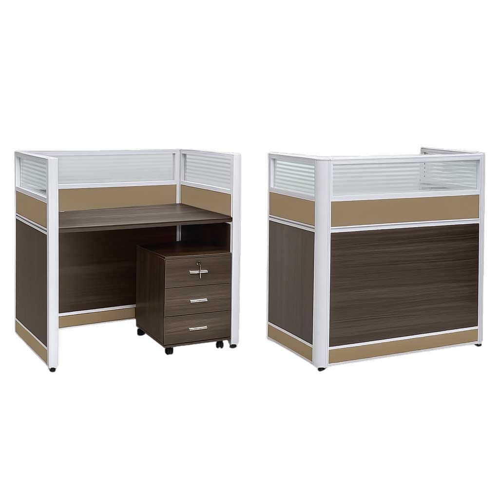 The single cubicle workstation is designed to create a functional and professional workspace while offering privacy and comfort. This single cubicle workstation features a strong white aluminum frame combined with premium dark walnut laminated panels and khaki accent panels, creating a clean and modern office appearance.